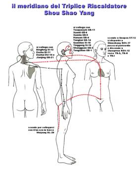 - Shou Shao Yang Sanjiao Jing: E' permeato di Yuanqi. I punti trattano i Liquidi, i disturbi metabolici e lo Yang del Rene.